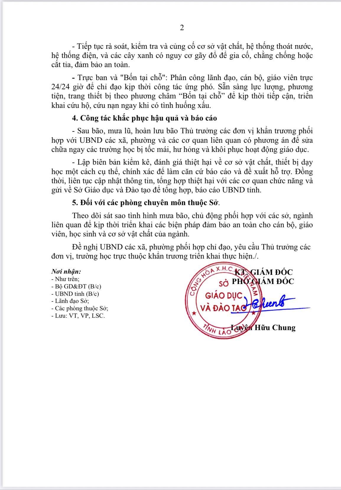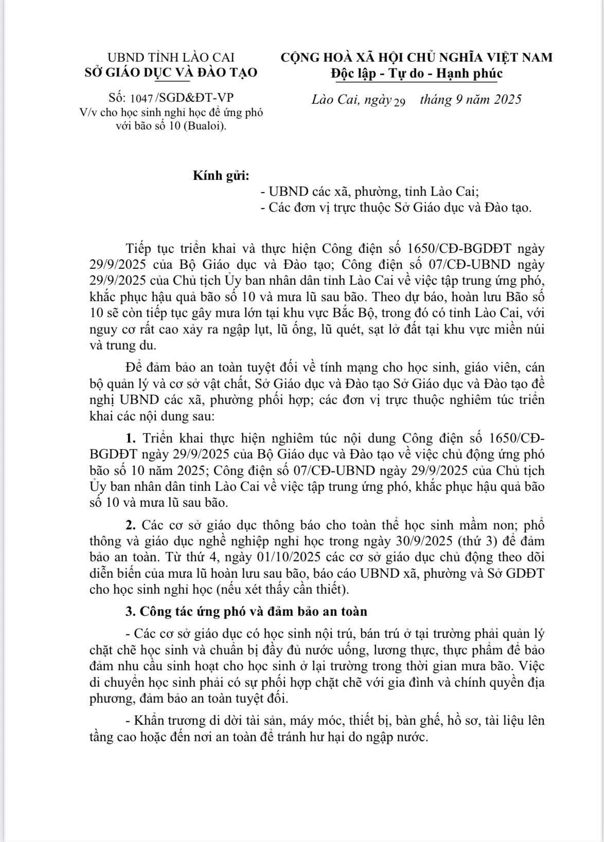 Thực hiện chỉ đạo của Sở Giáo dục và Đào tạo tỉnh Lào Cai, để đảm bảo an toàn tuyệt đối cho học sinh, giáo viên và cơ sở vật chất trường học trước diễn biến phức tạp của bão số 10, Trường TH Nguyễn Thái Học thông báo: Thứ ba (30/9/2025) HS toàn trường nghỉ học. Các ngày tiếp theo nhà trường sẽ thông báo sau.