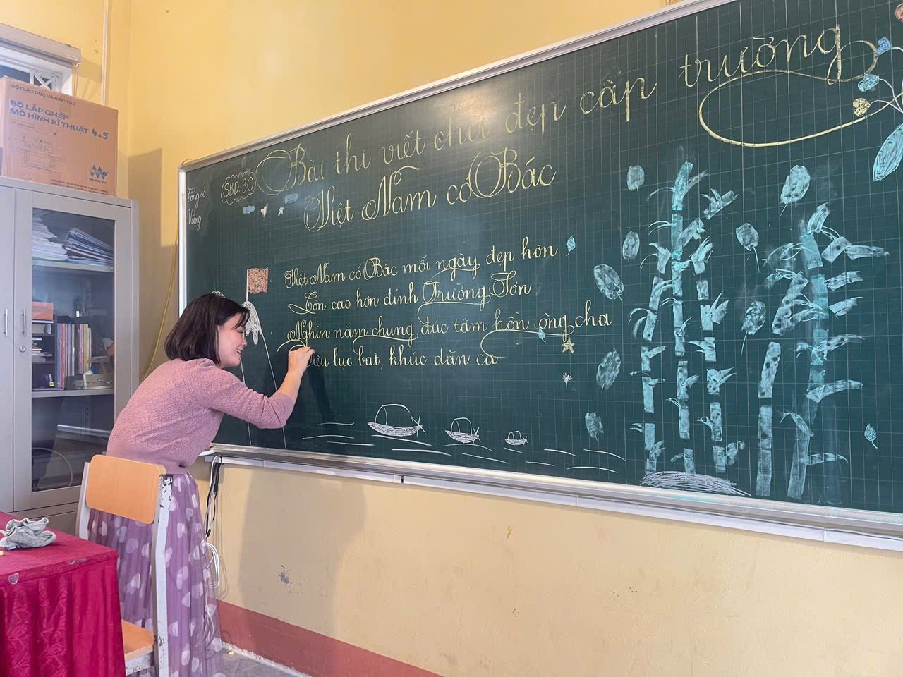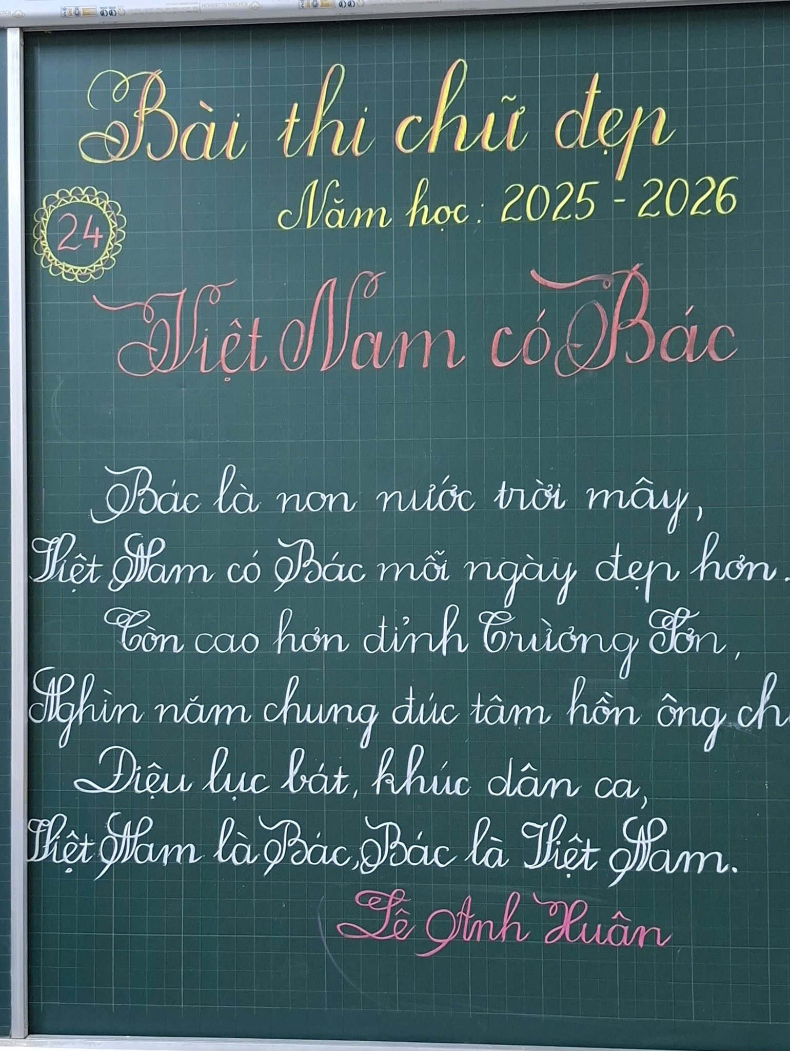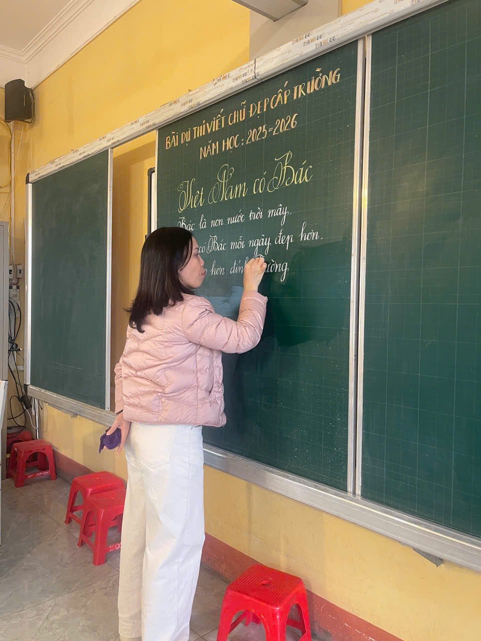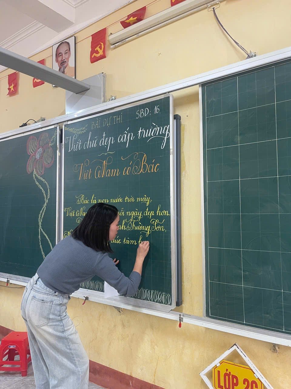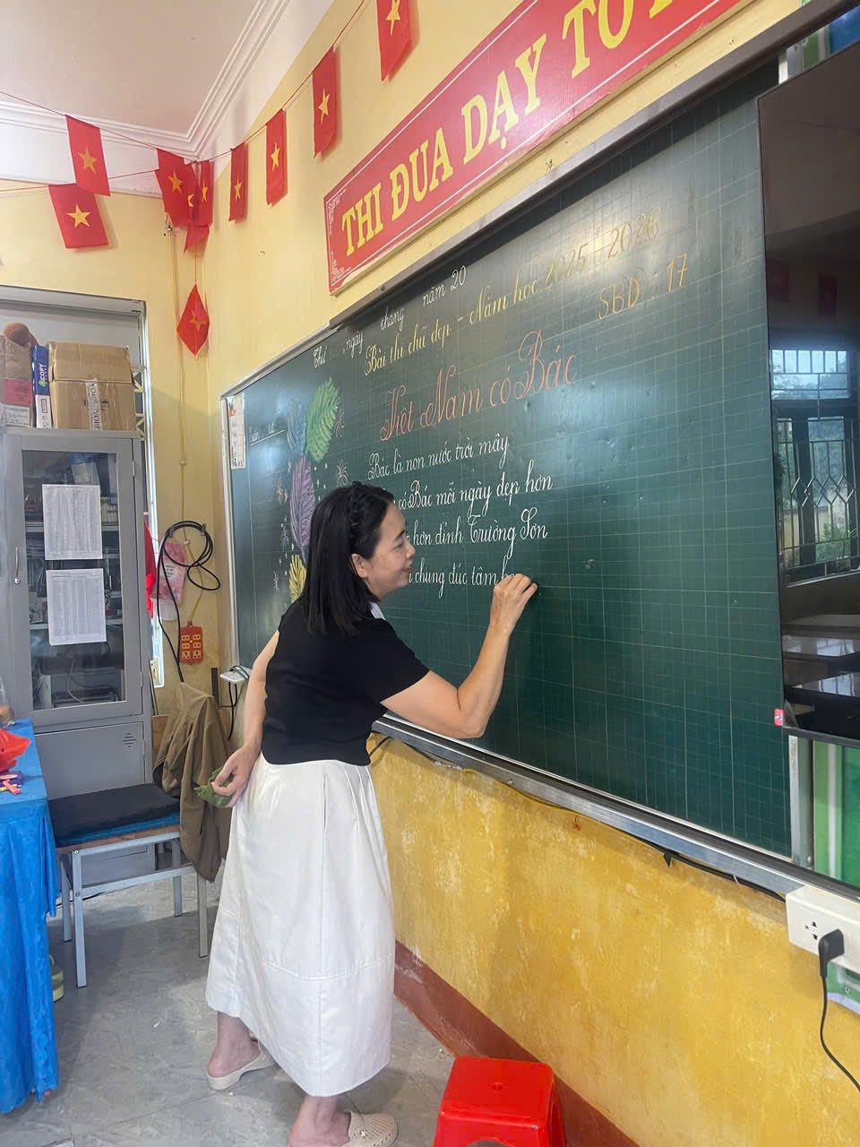 Song song đó, phần thi của các thầy cô giáo cũng để lại ấn tượng sâu sắc. Nội dung dự thi gồm hai phần: viết bảng và viết bài trên giấy theo mẫu quy định của nhà trường. Qua từng nét bút, các giáo viên đã truyền tải vẻ đẹp của chữ viết – một giá trị truyền thống luôn được đề cao trong môi trường giáo dục tiểu học. Nhiều bài thi nổi bật với bố cục hài hòa, trình bày khoa học và nét chữ tròn trịa, sáng rõ.
