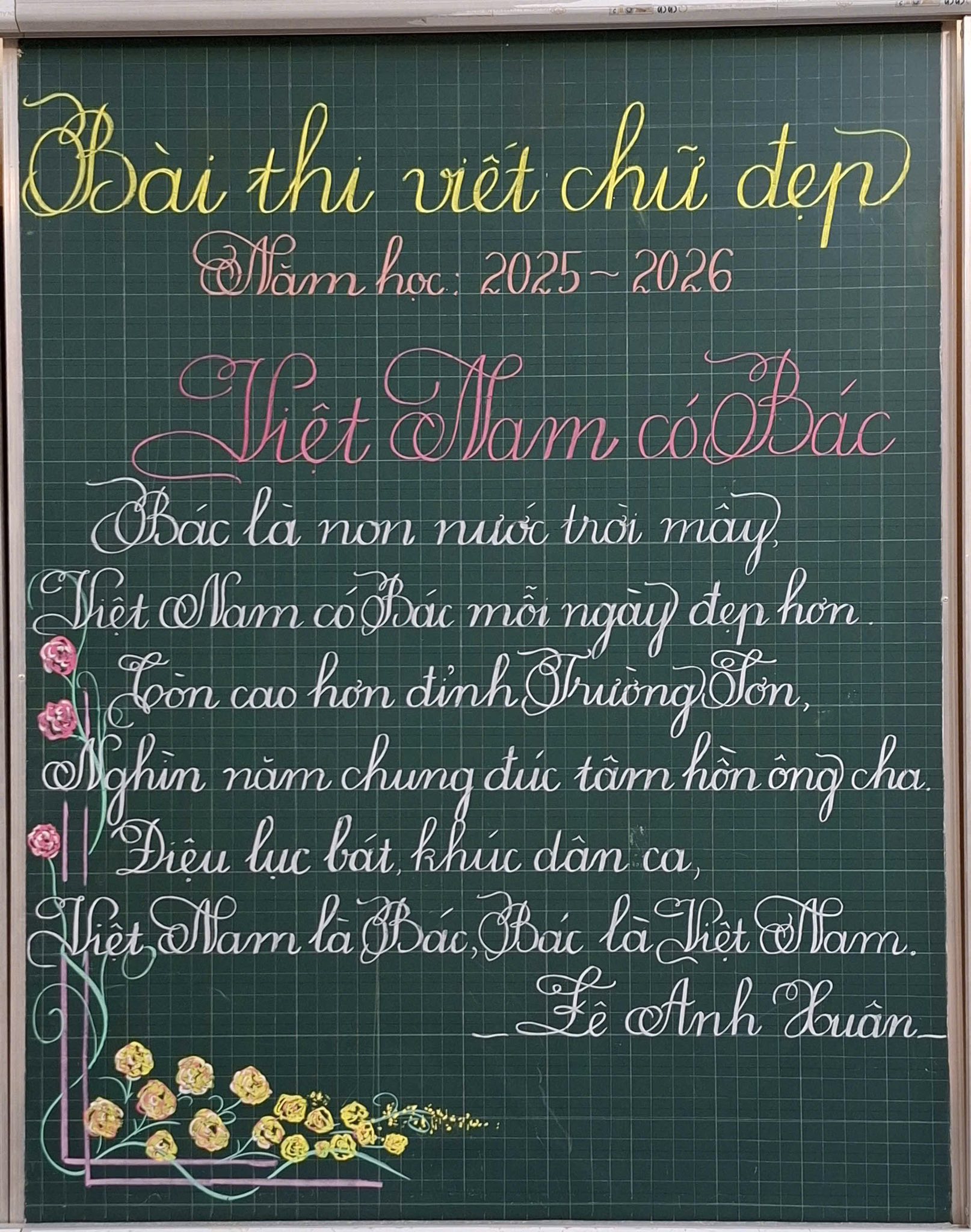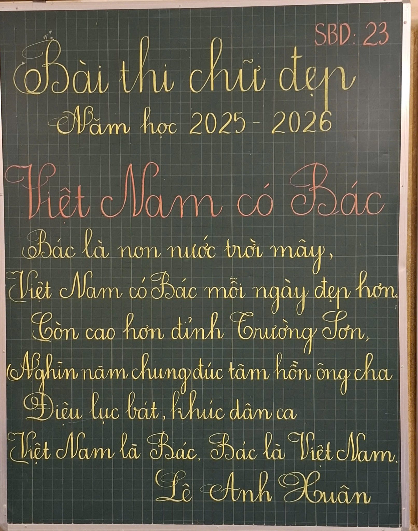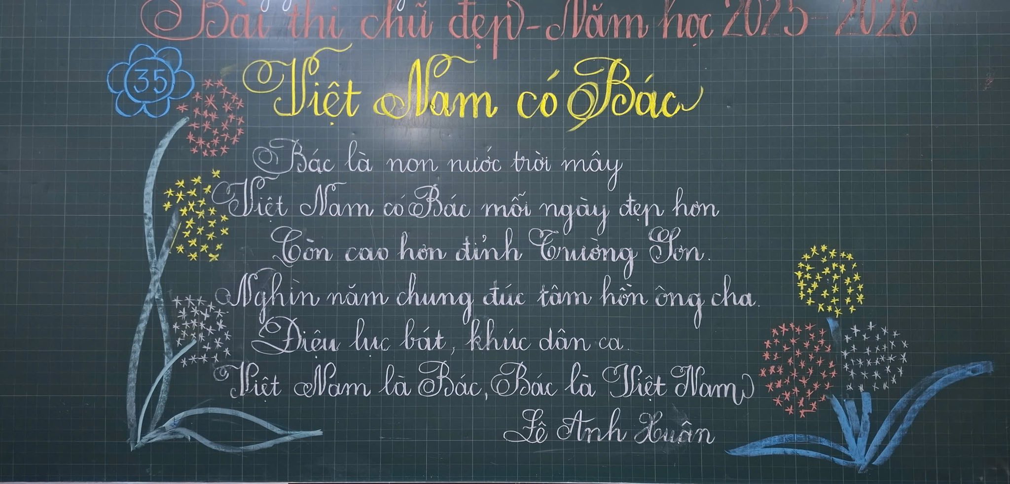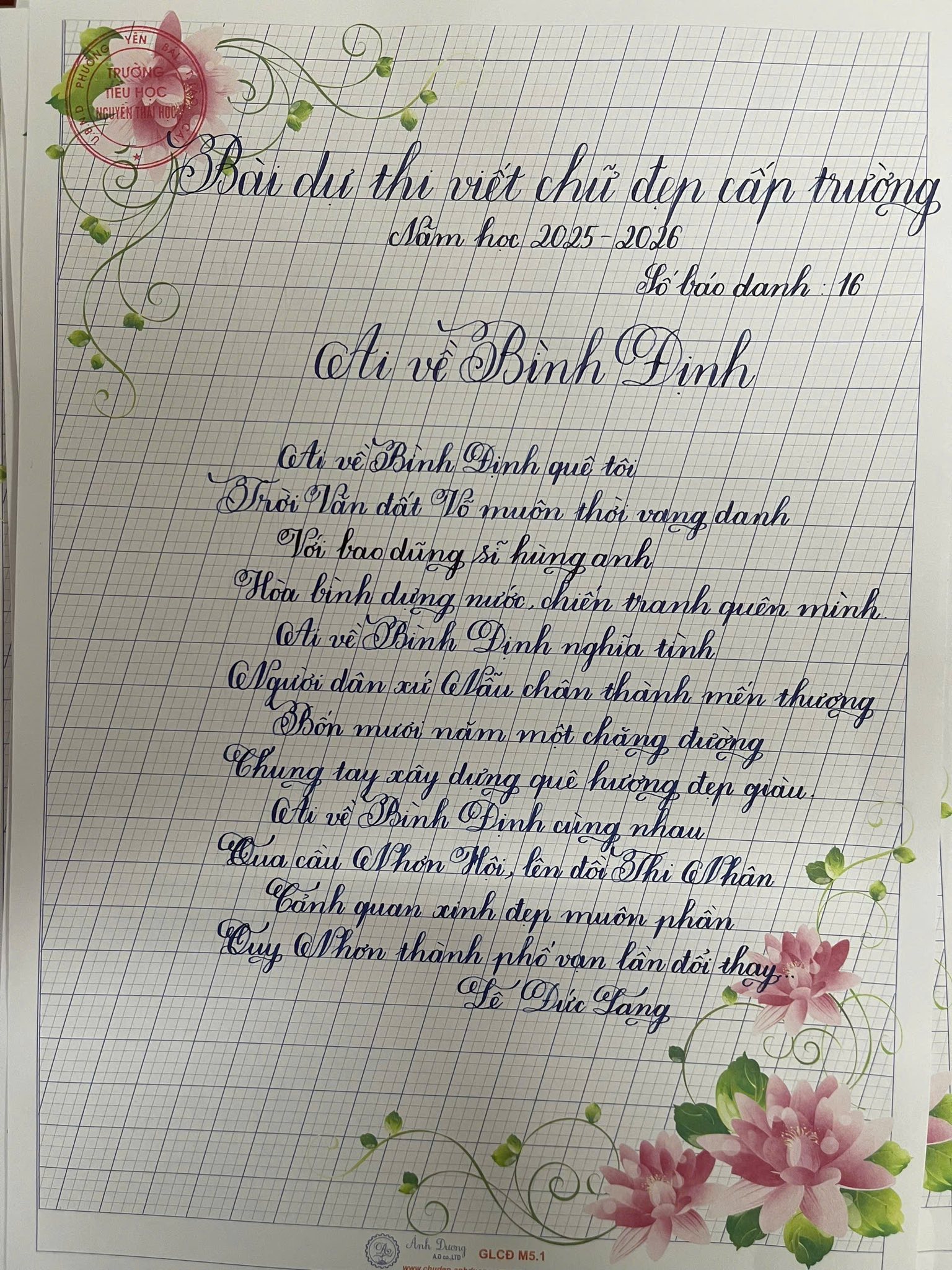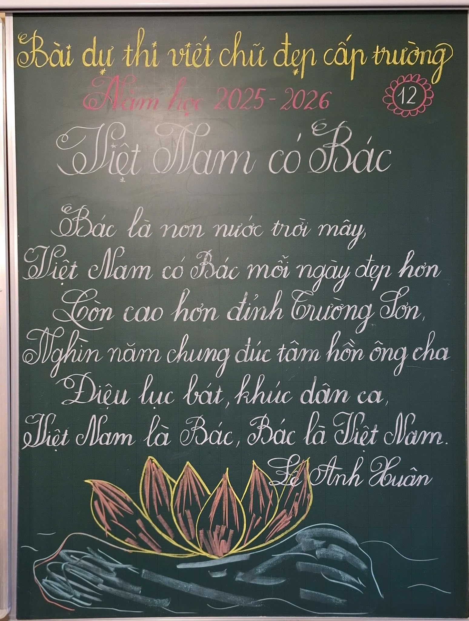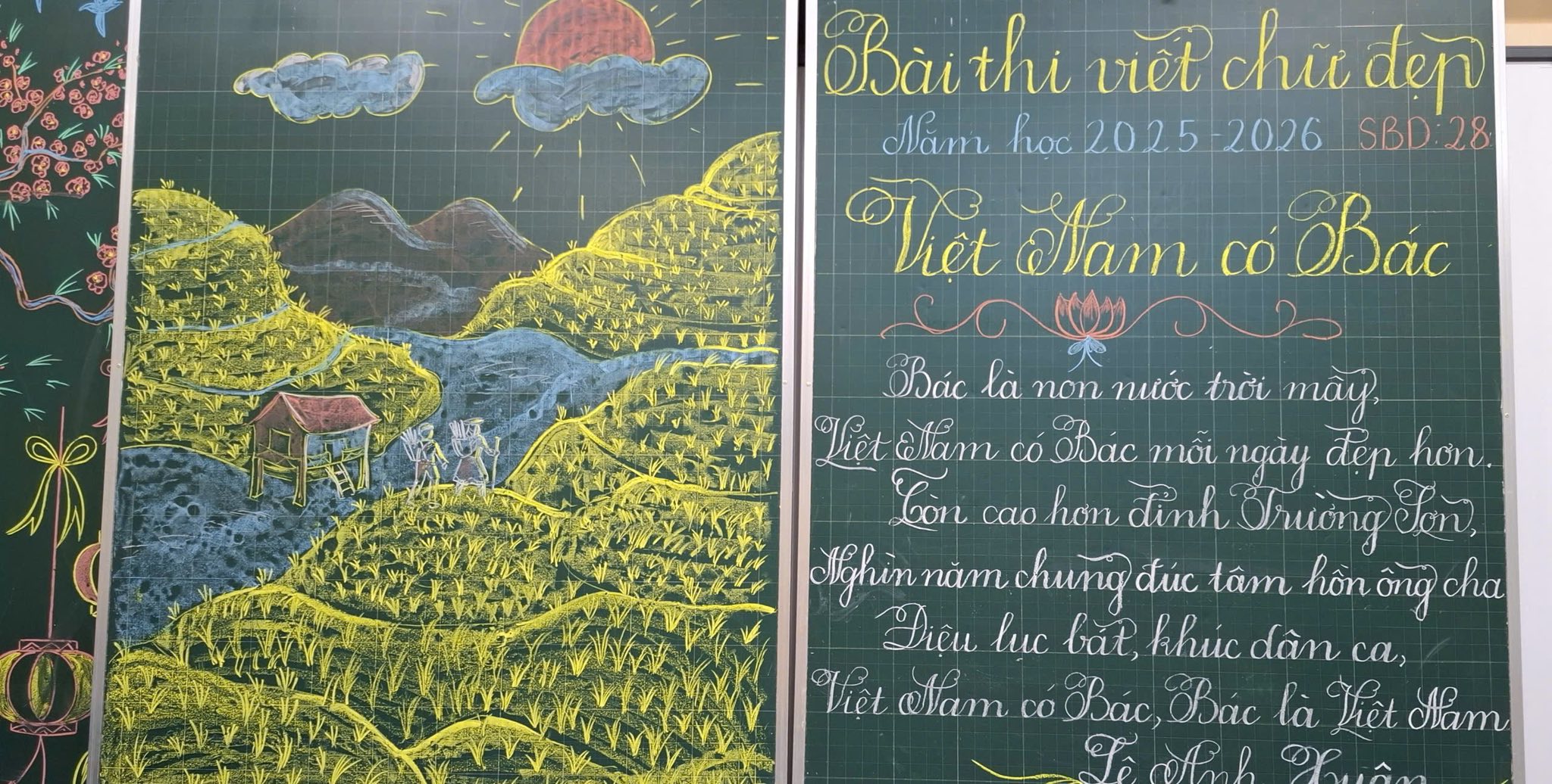 Song song đó, phần thi của các thầy cô giáo cũng để lại ấn tượng sâu sắc. Nội dung dự thi gồm hai phần: viết bảng và viết bài trên giấy theo mẫu quy định của nhà trường. Qua từng nét bút, các giáo viên đã truyền tải vẻ đẹp của chữ viết – một giá trị truyền thống luôn được đề cao trong môi trường giáo dục tiểu học. Nhiều bài thi nổi bật với bố cục hài hòa, trình bày khoa học và nét chữ tròn trịa, sáng rõ.