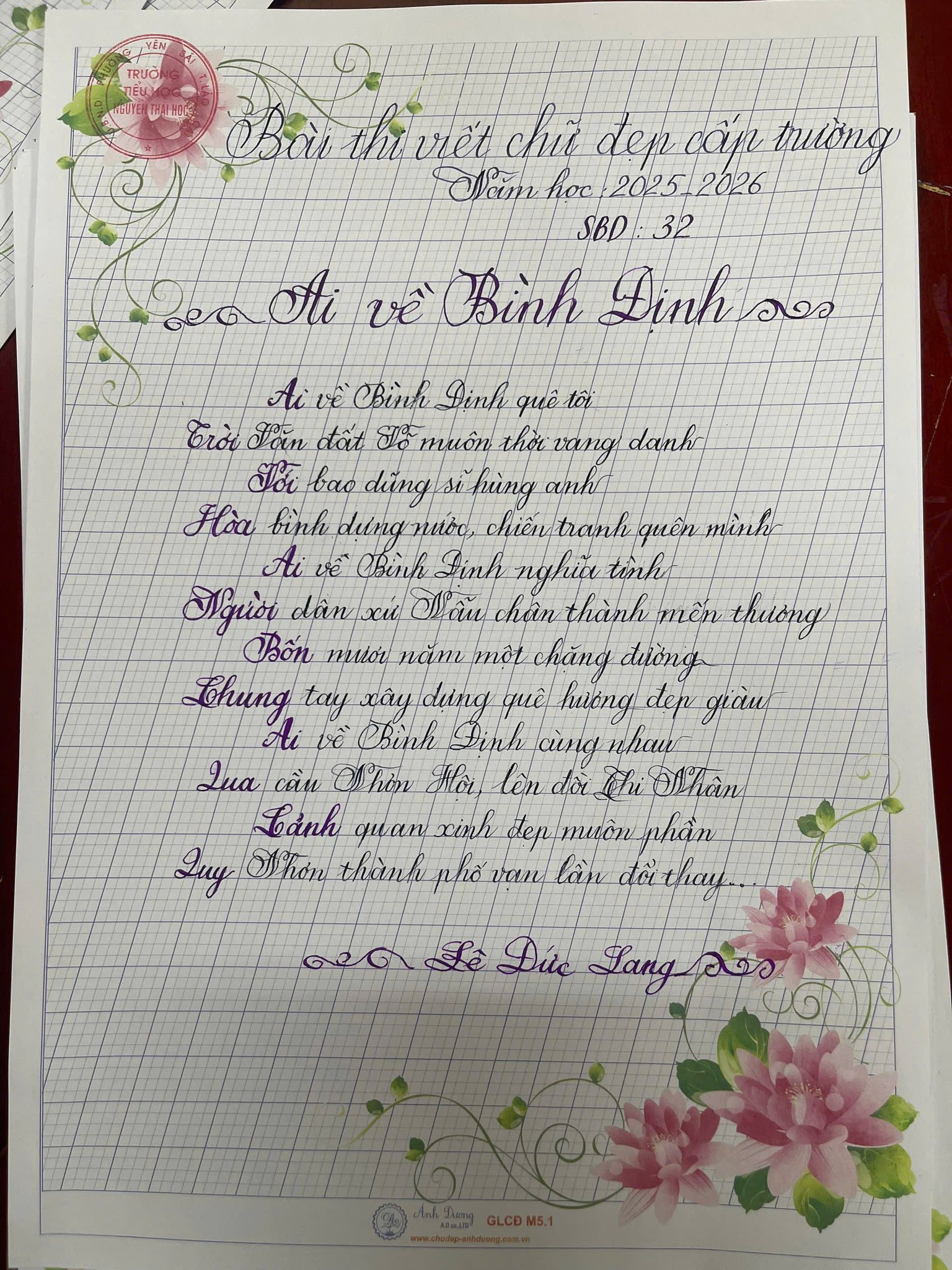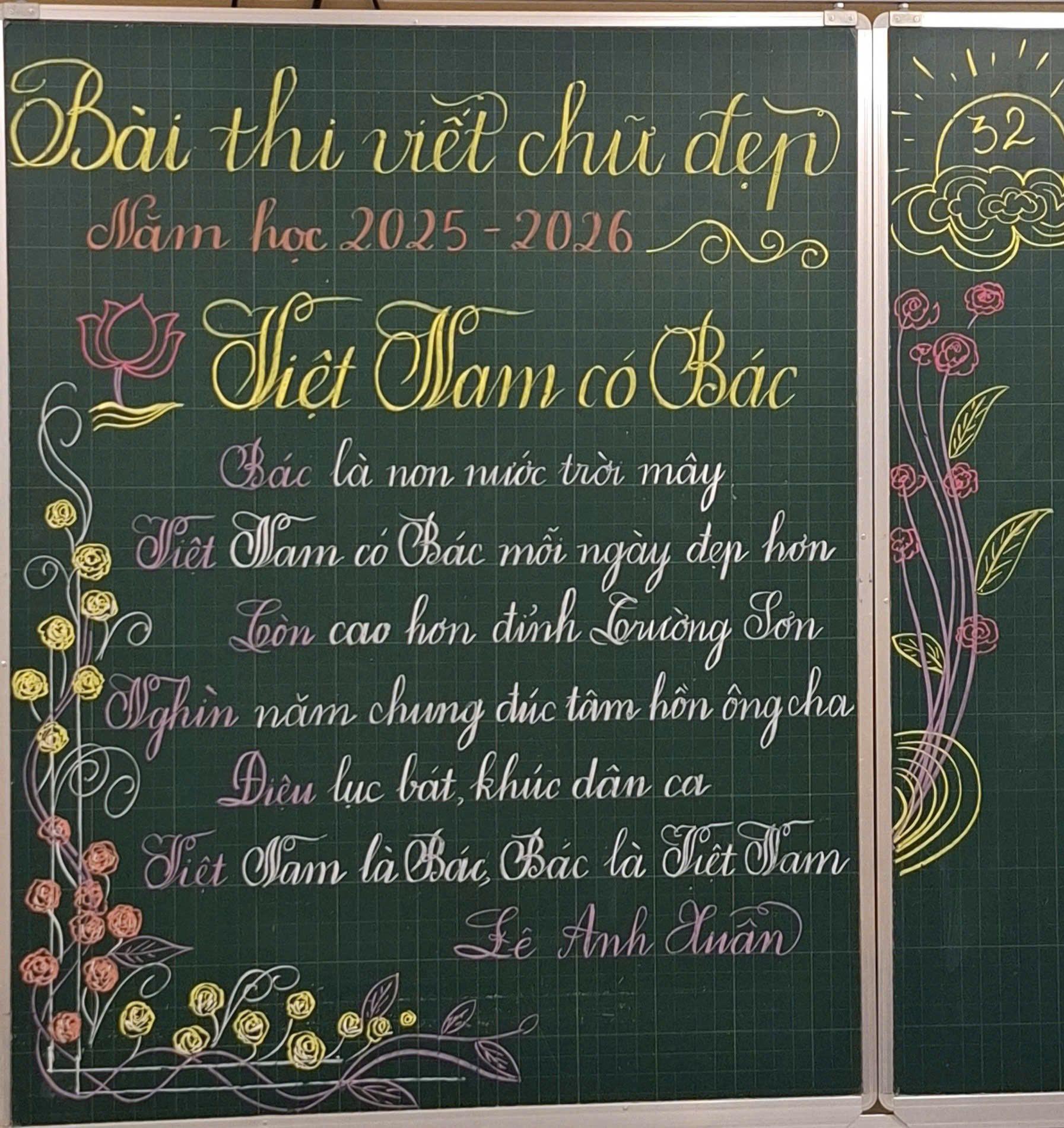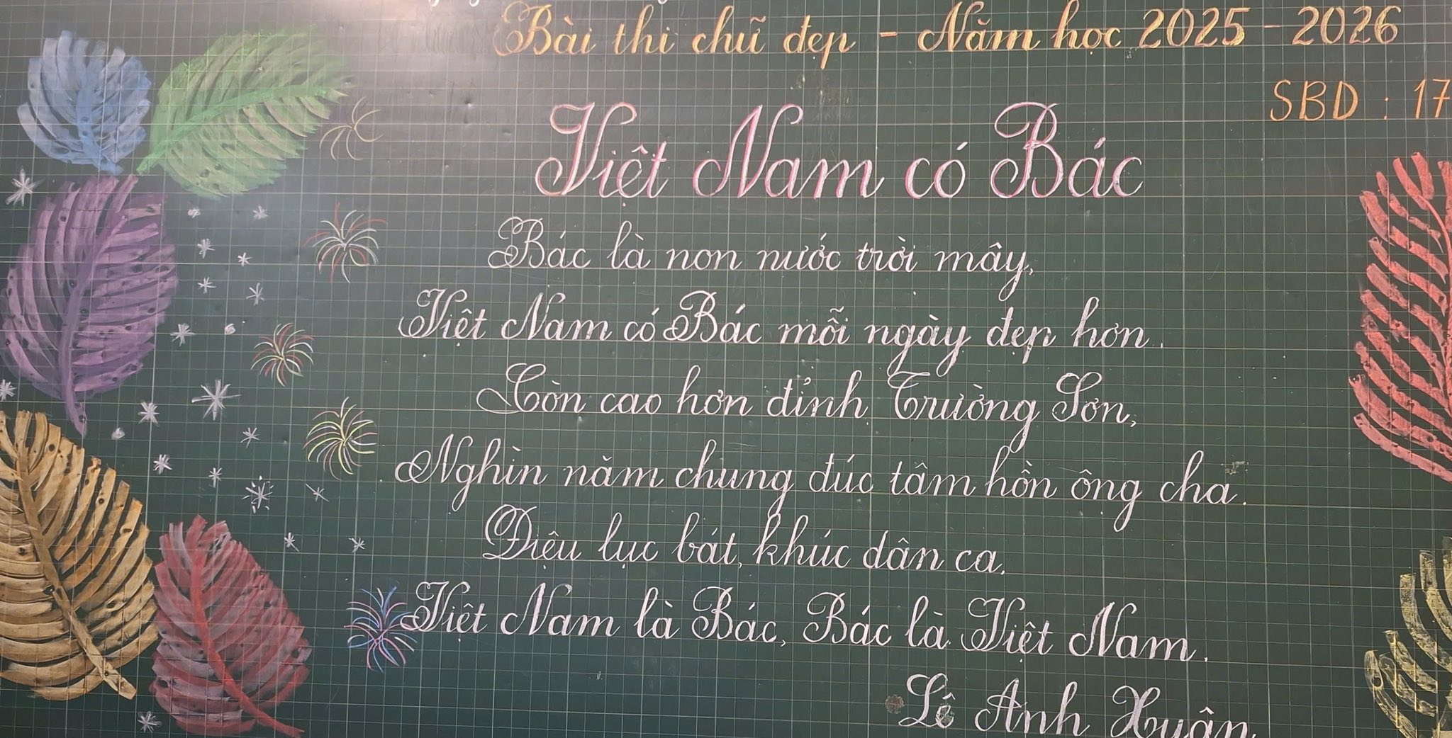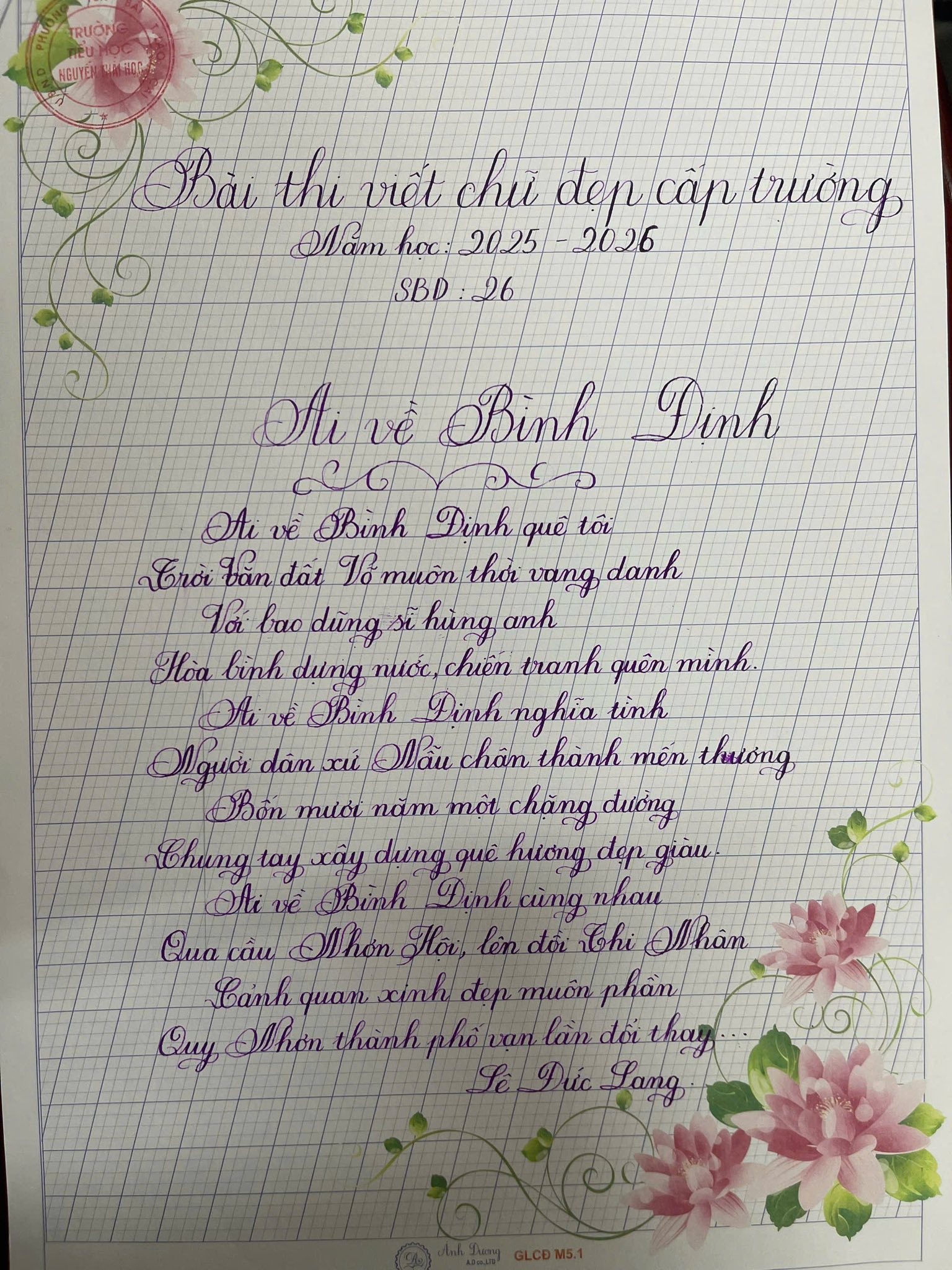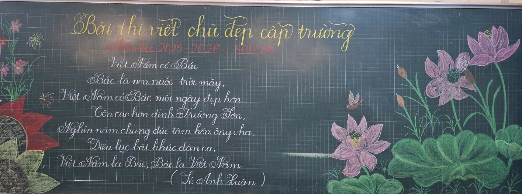 Song song đó, phần thi của các thầy cô giáo cũng để lại ấn tượng sâu sắc. Nội dung dự thi gồm hai phần: viết bảng và viết bài trên giấy theo mẫu quy định của nhà trường. Qua từng nét bút, các giáo viên đã truyền tải vẻ đẹp của chữ viết – một giá trị truyền thống luôn được đề cao trong môi trường giáo dục tiểu học. Nhiều bài thi nổi bật với bố cục hài hòa, trình bày khoa học và nét chữ tròn trịa, sáng rõ.