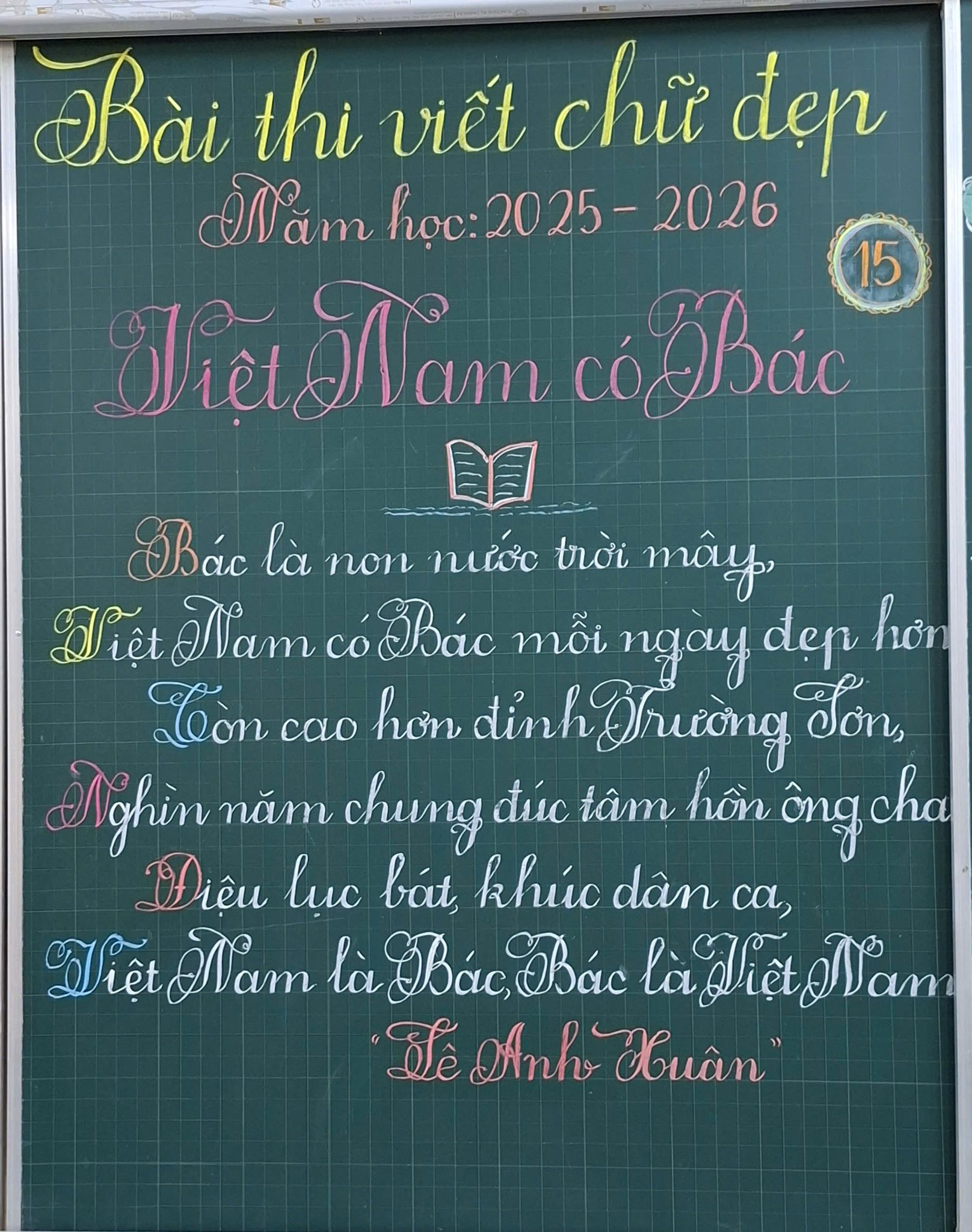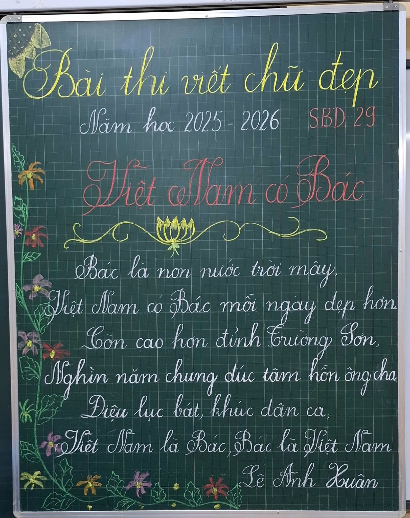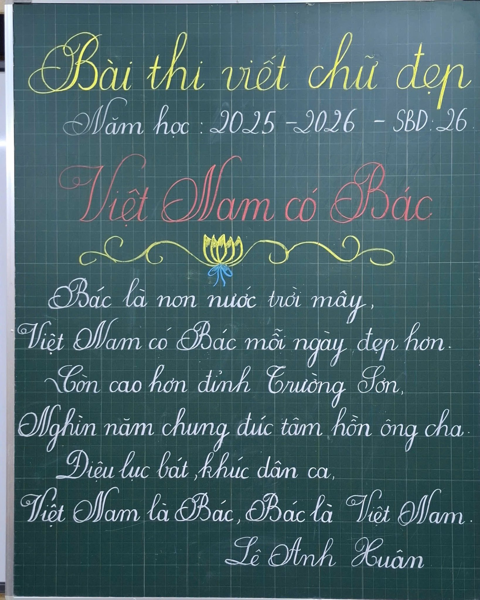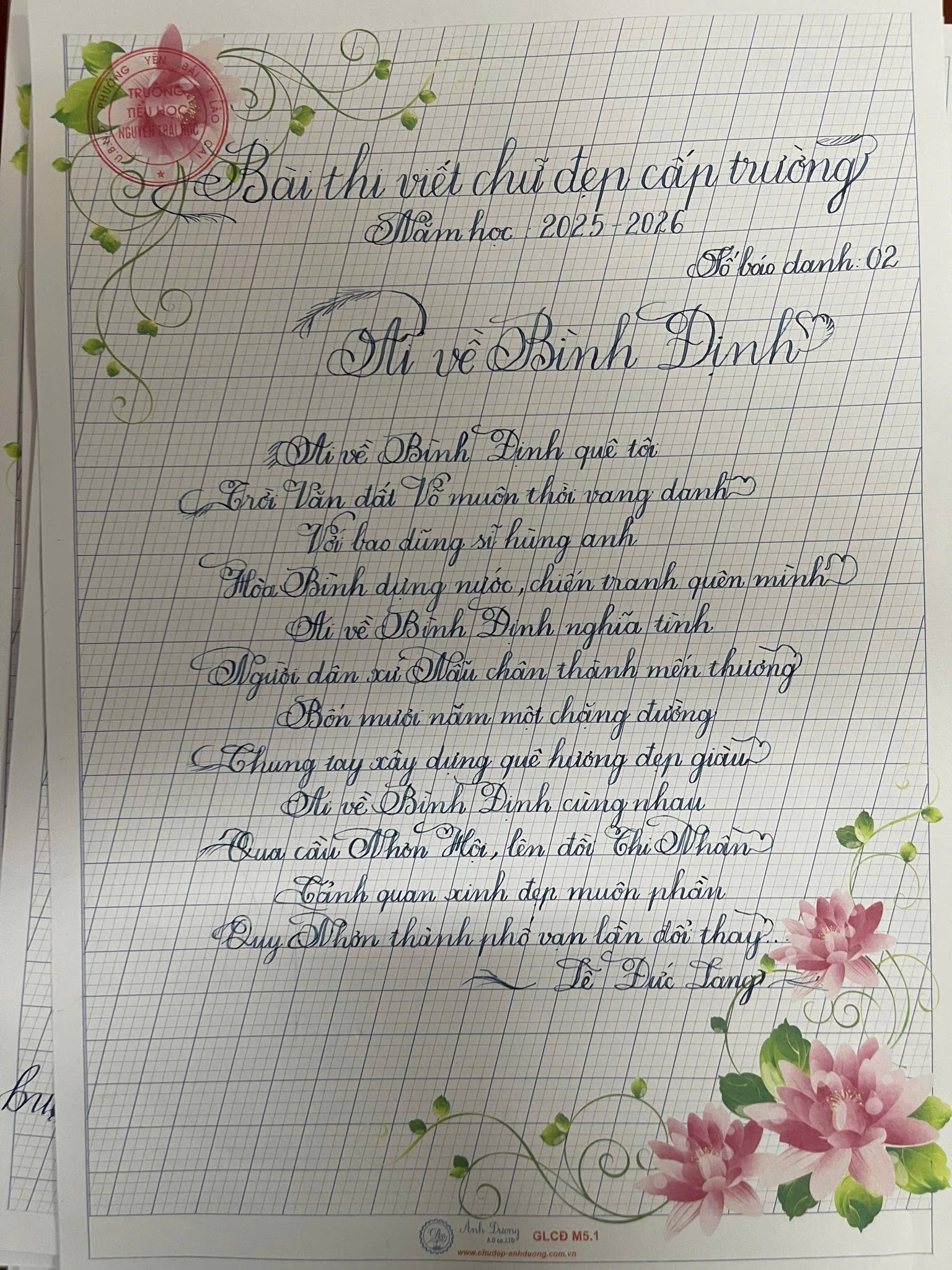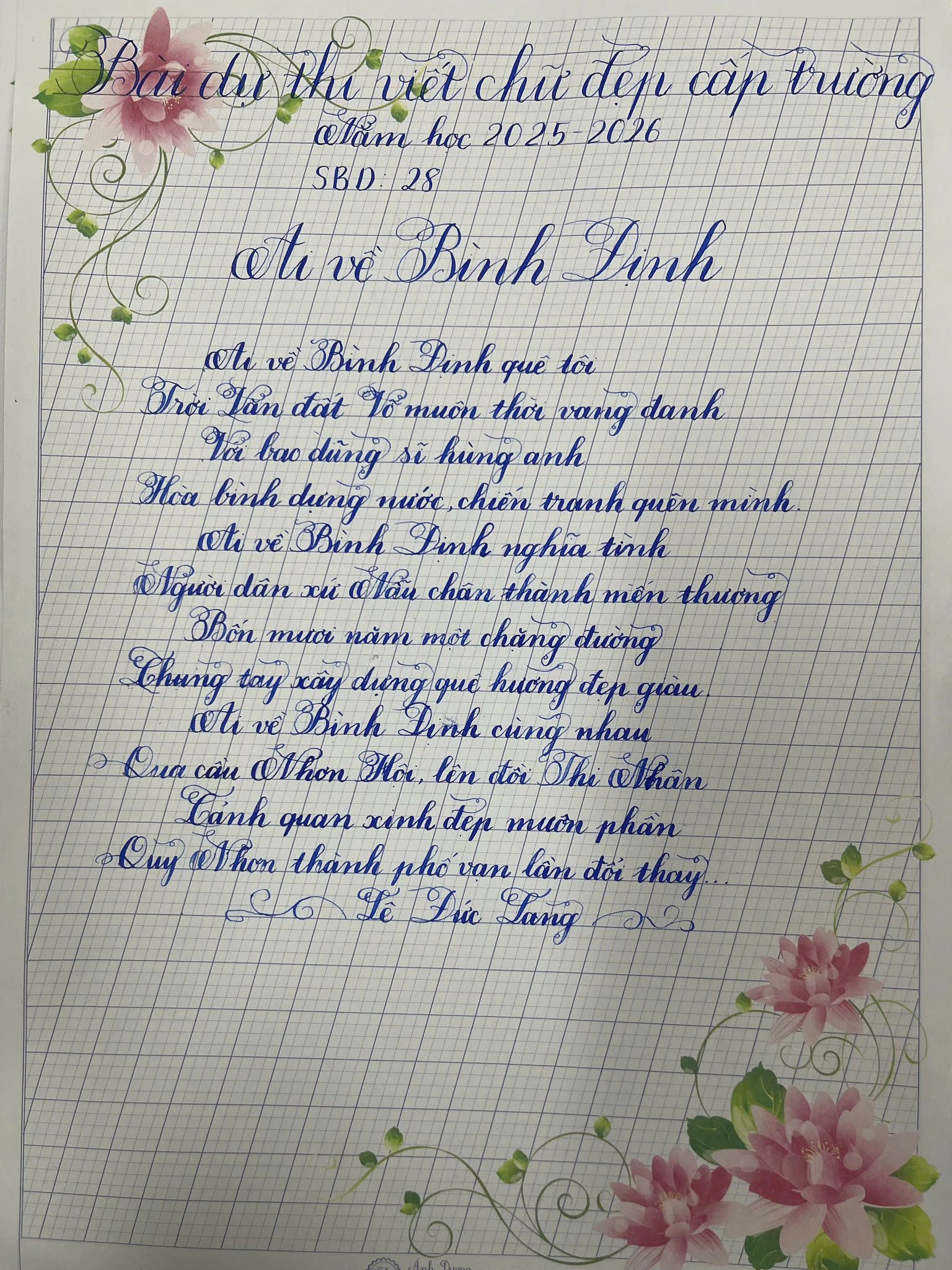 Song song đó, phần thi của các thầy cô giáo cũng để lại ấn tượng sâu sắc. Nội dung dự thi gồm hai phần: viết bảng và viết bài trên giấy theo mẫu quy định của nhà trường. Qua từng nét bút, các giáo viên đã truyền tải vẻ đẹp của chữ viết – một giá trị truyền thống luôn được đề cao trong môi trường giáo dục tiểu học. Nhiều bài thi nổi bật với bố cục hài hòa, trình bày khoa học và nét chữ tròn trịa, sáng rõ.